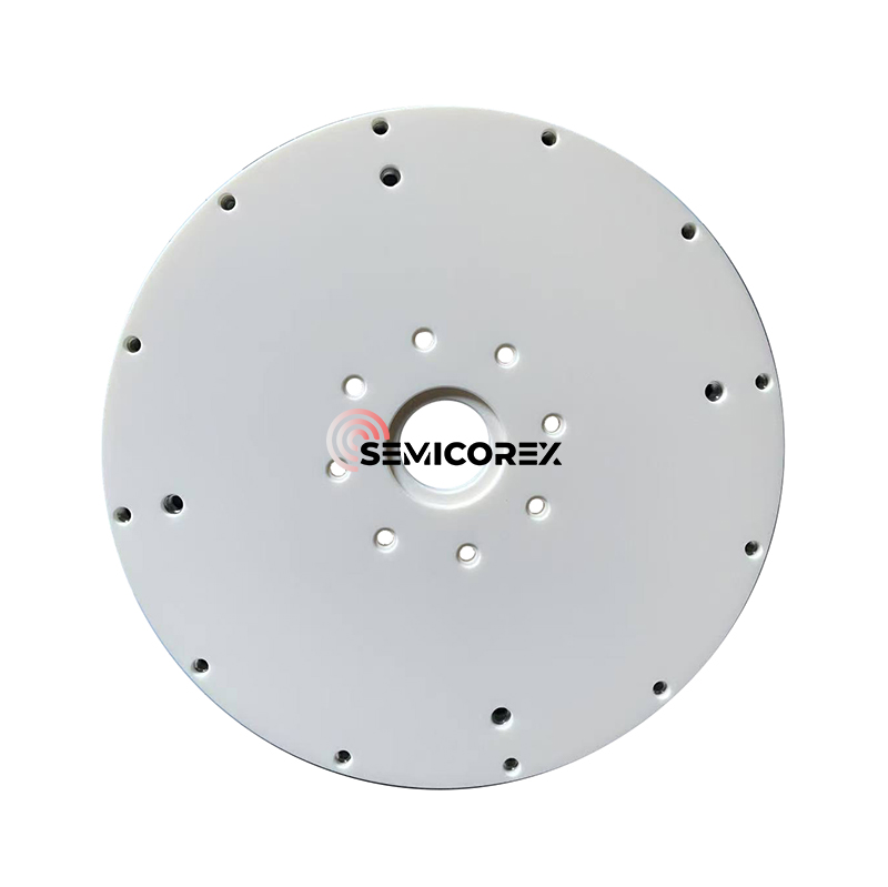 सेमीकोरेक्स एल्युमिना माउंटिंग बेस प्लेट्स ही सेमीकंडक्टर फॅब्रिकेशन उपकरणांमध्ये माउंटिंग वर्क चक्ससाठी टिकाऊ आणि स्थिर तळ म्हणून डिझाइन केलेले उच्च-शुद्धता सिरेमिक उत्पादने आहेत. या प्लेट्स लिथोग्राफी, एचिंग, जमा आणि तपासणी यासारख्या वेफर प्रोसेसिंग ऑपरेशन्ससाठी गंभीर यांत्रिक समर्थन आणि संरेखन प्रदान करतात. आवश्यक निष्ठा सह वेफर प्रक्रिया होऊ शकते हे सुनिश्चित करण्यासाठी इतर सिस्टम घटकांसह चकचे कार्य अचूकपणे संरेखित करणे आवश्यक आहे. प्रक्रिया आणि क्लीनरूम या दोन्ही वातावरणात आधुनिक सेमीकंडक्टर फॅब्रिकेशनच्या कठोर आवश्यकता पूर्ण करण्यासाठी आवश्यक सपाटपणा, उच्च-तापमान टिकाऊपणा आणि दीर्घकालीन विश्वसनीयता साध्य करण्यासाठी सिरेमिकस विशिष्ट प्रक्रियेच्या तंत्राद्वारे प्लेट्स तयार केल्या जातात.