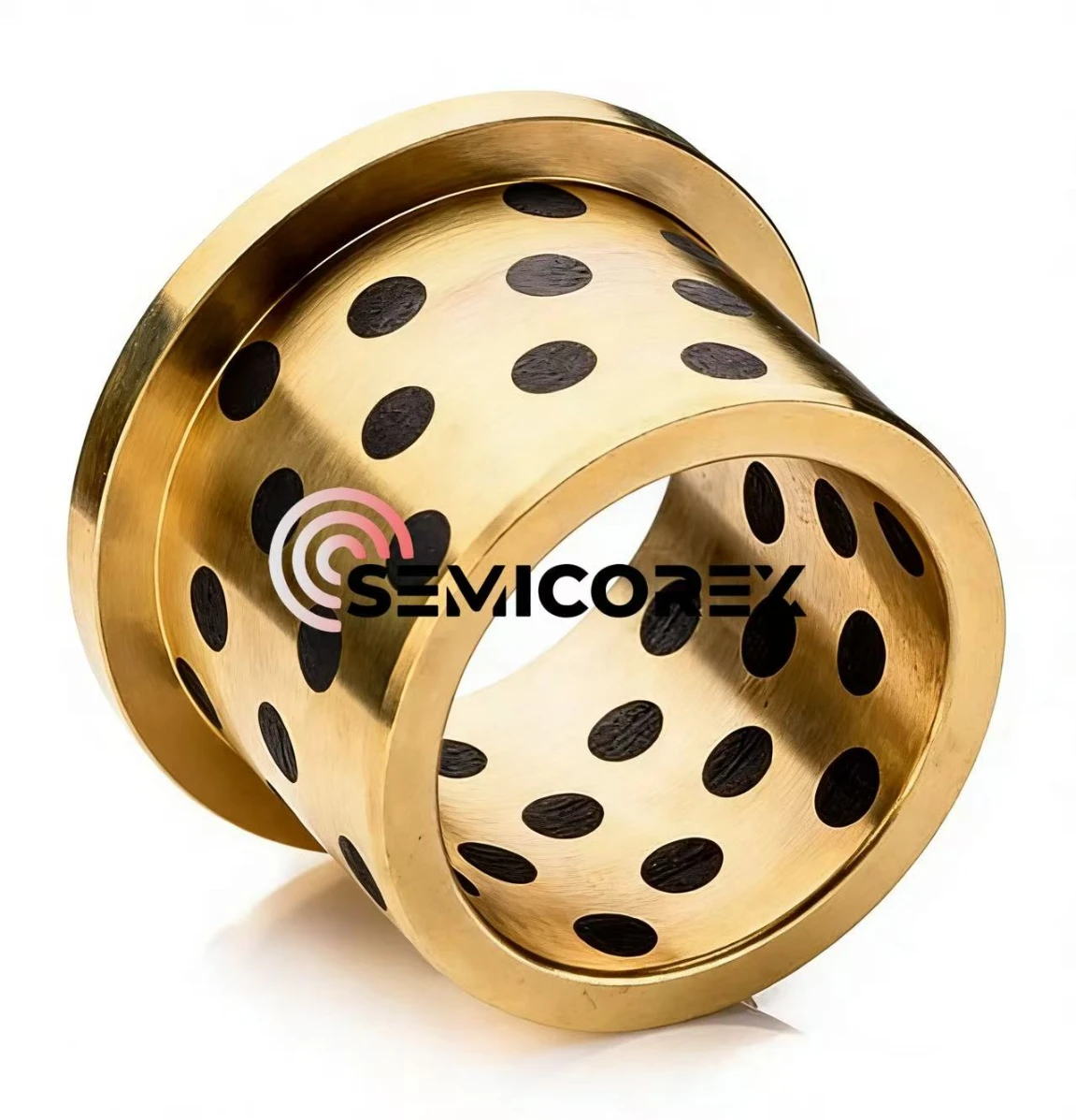 सेमीकोरेक्स ग्रेफाइट सेल्फ-लुब्रिकेटिंग बुशिंग्स कूपर मिश्र धातु मॅट्रिक्स आणि घन ग्रेफाइट प्लगने बनलेले असतात. ग्रेफाइट सेल्फ-लुब्रिकेटिंग बुशिंग्सच्या घर्षण पृष्ठभागावर अनेक सुस्पष्टता-मशीन छिद्रे व्यवस्थित वितरीत केली जातात, प्रत्येक विशेष तयार केलेल्या घन ग्रेफाइट प्लगने भरलेली असते. ऑपरेशन दरम्यान, ग्रेफाइटचे कण हळूहळू छिद्रांमधून सोडले जातात आणि शाफ्ट आणि बुशिंग दरम्यान घर्षण पृष्ठभागावर हस्तांतरित केले जातात, ज्यामुळे एक स्थिर स्नेहन फिल्म तयार होते. ही ग्रेफाइट स्नेहन फिल्म थेट मेटल-ऑन-मेटल संपर्क काढून टाकते, घर्षण गुणांक लक्षणीयरीत्या कमी करते आणि घटक पोशाख कमी करते.