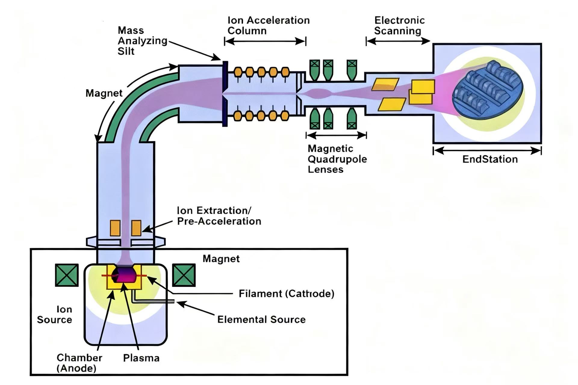 2.आयन इम्प्लांटेशन हे अर्धसंवाहक उत्पादनातील प्राथमिक डोपिंग तंत्र आहे, ज्याचे अनेक फायदे आहेत, जसे की उच्च डोपिंग अचूकता, कमी प्रक्रिया तापमान आणि सब्सट्रेट सामग्रीचे थोडे नुकसान. विशेषत:, आयन इम्प्लांटेशन प्रक्रियेमध्ये चार्ज केलेले आयन तयार करण्यासाठी अशुद्धता अणूंचे आयनीकरण करणे आवश्यक आहे, त्यानंतर उच्च-तीव्रतेच्या विद्युत क्षेत्राद्वारे या आयनांचा वेग वाढवून उच्च-ऊर्जा आयन बीम तयार होतो. सेमीकंडक्टर पृष्ठभागावर या जलद-गतिशील आयनांचा परिणाम होतो, ज्यामुळे समायोज्य डोपिंग खोलीसह अचूक रोपण करता येते. हे तंत्र विशेषतः उथळ जंक्शन स्ट्रक्चर्स तयार करण्यासाठी उपयुक्त आहे, जसे की MOSFETs चे स्त्रोत आणि निचरा क्षेत्र, आणि अशुद्धतेच्या वितरण आणि एकाग्रतेवर उच्च-सुस्पष्टता नियंत्रण करण्यास अनुमती देते.