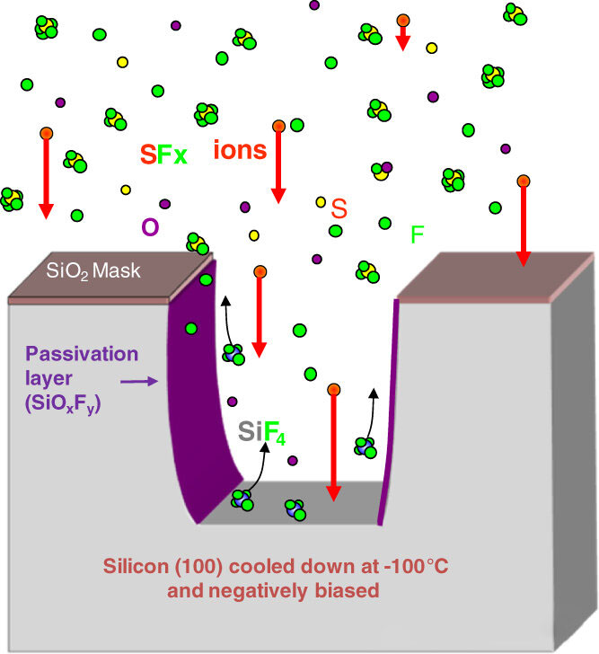 स्फटिकासारखे सिलिकॉनचे उदाहरण घेतल्यास, सिलिकॉन अणूंची मांडणी क्रिस्टल ओरिएंटेशनमध्ये भिन्न असते, परिणामी एचिंग गॅस आणि एचिंग रेटसह प्रतिक्रियाशीलतेमध्ये फरक होतो. कोरीव काम करताना, भौतिक गुणधर्मांमधील या फरकांमुळे साइडवॉलवर वेगवेगळ्या ठिकाणी विसंगत खोदकामाची खोली निर्माण होते, ज्यामुळे शेवटी साइडवॉल वाकते.