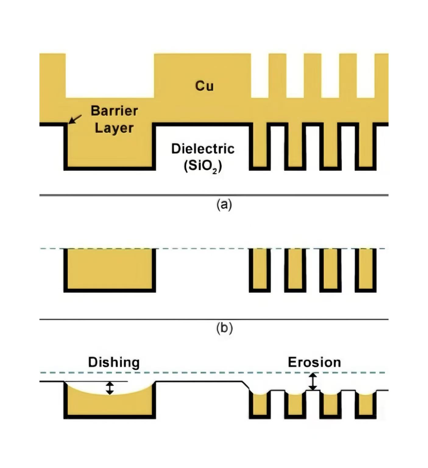 केमिकल मेकॅनिकल पॉलिशिंग (सीएमपी), जे पृष्ठभागावरील अपूर्णता दूर करण्यासाठी रासायनिक गंज आणि यांत्रिक पॉलिशिंग एकत्र करते, ही संपूर्ण प्लॅनराइझेशन साध्य करण्यासाठी महत्त्वपूर्ण अर्धसंवाहक प्रक्रिया आहे.वेफरपृष्ठभाग सीएमपीचा परिणाम दोन पृष्ठभाग दोष, डिशिंग आणि इरोशनमध्ये होतो, जे इंटरकनेक्ट संरचनांच्या सपाटपणा आणि विद्युत कार्यक्षमतेवर लक्षणीय परिणाम करतात.