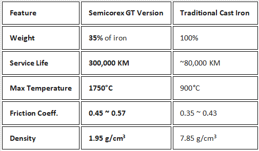 वजन हा कामगिरीचा शत्रू आहे. सेमिकोरेक्स रोटर्सची घनता 1.8 आणि 2 g/cm³ दरम्यान असते.