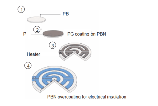 पायरोलाइटिक बोरॉन नायट्राइड-पायरोलाइटिक ग्रेफाइट (पीबीएन-पीजी) कंपोझिट हीटर एक हीटर आहे जो उच्च-इन्सुलेशन पीबीएन सब्सट्रेट म्हणून वापरतो आणि कमी दाबाने (10 टॉरच्या खाली) आणि उच्च तापमानात कमी-दाब थर्मल विघटन केमिकल वाष्प जमा (सीव्हीडी) वापरतो. या संमिश्र हीटरचे मुख्य घटक पायरोलाइटिक बोरॉन नायट्राइड (पीबीएन) आणि पायरोलाइटिक ग्रेफाइट (पीजी) आहेत. त्याच्या उत्कृष्ट गंज प्रतिकार आणि उच्च तापमान प्रतिकारांमुळे, हे मुख्यतः सेमीकंडक्टर सब्सट्रेट हीटिंगसाठी (एमबीई, एमओसीव्हीडी, स्पटरिंग कोटिंग इ. मध्ये वापरले जाते) वापरले जाते; सुपरकंडक्टर सब्सट्रेट हीटिंग; नमुना विश्लेषण दरम्यान नमुना हीटिंग; इलेक्ट्रॉन मायक्रोस्कोप नमुना हीटिंग; मेटल हीटिंग; मेटल बाष्पीभवन हीटिंग स्रोत, इ.
