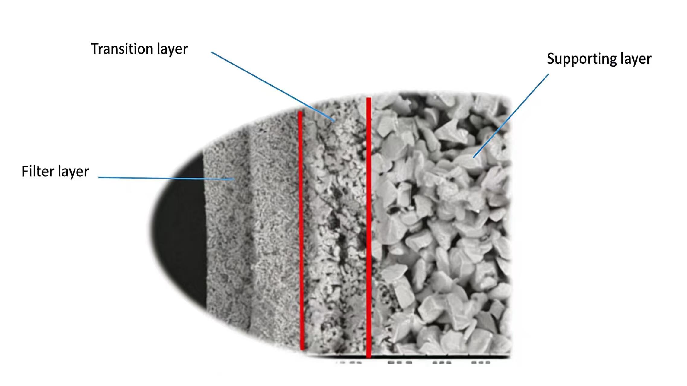 सेमीकोरेक्सSiC सिरेमिकसपाट पडदा एक ग्रेडियंट छिद्र रचना प्रदर्शित करतात, जी तीन-स्तर संमिश्र रचनांनी बनलेली असते: एक 0.04µm दाट मायक्रोपोरस पृथक्करण स्तर, 0.5µm दाट मायक्रोपोरस दुय्यम पृथक्करण स्तर आणि 8µm ओपन मॅक्रोपोरस सपोर्ट लेयर. ही विशेष-डिझाइन केलेली ग्रेडियंट छिद्र रचना वेगवेगळ्या आकाराचे रेणू, कण किंवा आयन यांचे अचूक भौतिक चाळणी साध्य करते. छिद्राच्या आकारापेक्षा लहान पदार्थ झिल्लीच्या छिद्रांमधून सहजतेने जाऊ शकतात, तर छिद्राच्या आकारापेक्षा मोठे पदार्थ पडद्याच्या पृष्ठभागावर किंवा छिद्रांमध्ये टिकून राहतात, त्यामुळे कार्यक्षम पृथक्करण आणि गाळण्याची प्रक्रिया साध्य होते.
