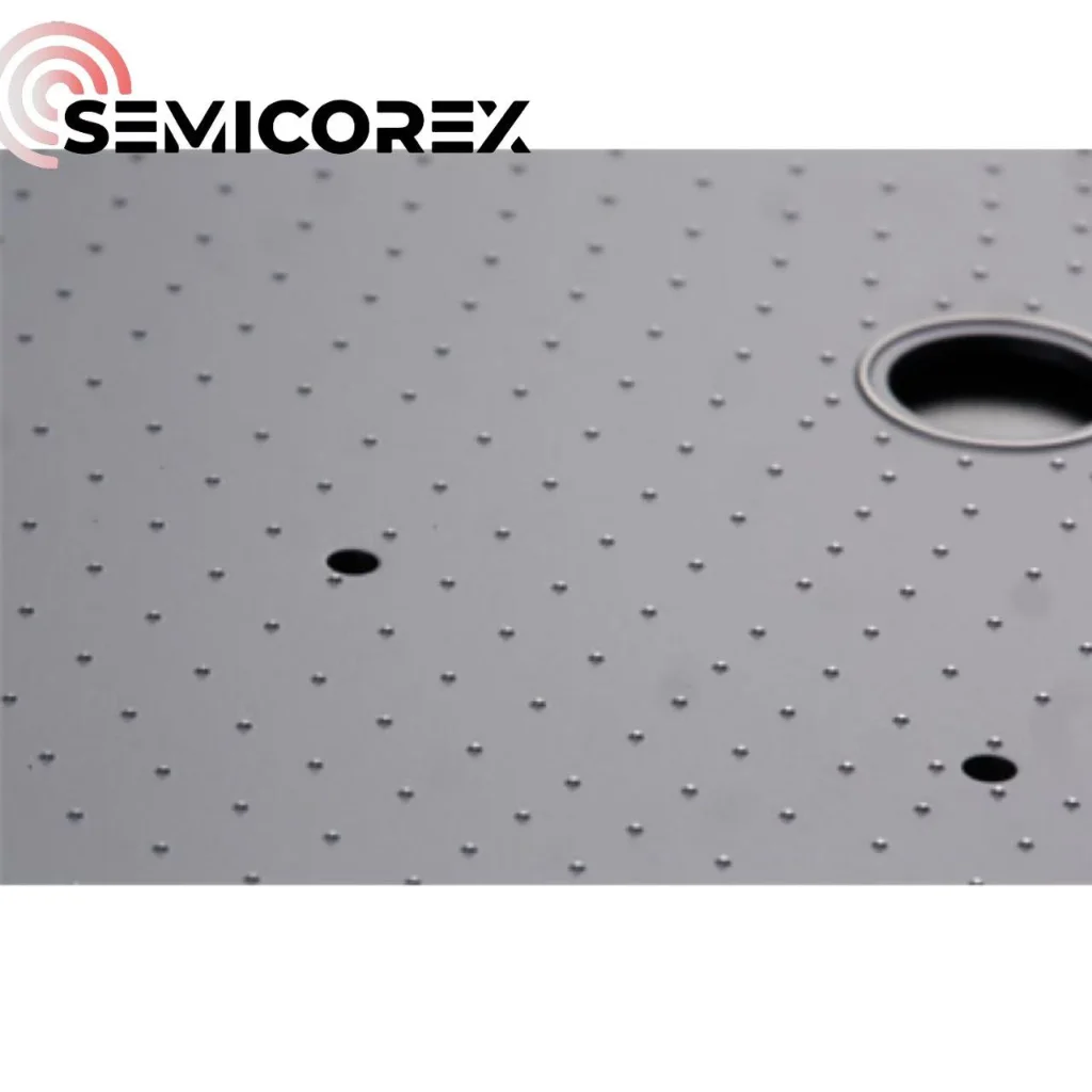 सेमीकोरेक्सची पृष्ठभागसिलिकॉन कार्बाइडपिन चक्स असंख्य मायक्रॉन-आकाराच्या धक्क्यांसह ॲरे केलेले आहेत. संपर्क क्षेत्र कमी केले जाते कारण वेफरच्या मागील बाजूस संपर्क फक्त अडथळ्यांवर होतो, जे प्रभावीपणे अनावश्यक वेफर स्क्रॅच, कण दूषित आणि खुणा टाळतात.