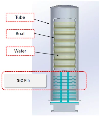 सेमिकोरेक्स घनसिलिकॉन कार्बाइड पंखते सामान्यत: सेमीकंडक्टर थर्मल ट्रीटमेंट उपकरणांच्या उभ्या फर्नेस ट्यूबमध्ये थर्मल इन्सुलेशन घटक म्हणून स्थापित केले जातात, जसे की आरटीपी ॲनिलिंग फर्नेसेस आणि डिफ्यूजन फर्नेस. सेमीकोरेक्स सॉलिड सिलिकॉन कार्बाइड फिन्स उच्च-तापमान भट्टीमध्ये तापमान वितरणाचे प्रभावीपणे नियमन करू शकतात आणि उच्च तापमानामुळे दरवाजाच्या सीलिंग भागांवर प्रक्रिया करण्यासाठी उष्णतेचे नुकसान कमी करू शकतात. ओले ऑक्सिडेशन ऑपरेटिंग परिस्थितीत, सेमीकोरेक्स सॉलिड सिलिकॉन कार्बाइड फिनचा वापर प्रक्रिया परिणामांवर आणि तुलनेने कमी प्रक्रिया तापमानात पाण्याच्या वाफेच्या संक्षेपणामुळे होणारे सेमीकंडक्टर उपकरणांवर होणारे नकारात्मक परिणाम प्रभावीपणे रोखण्यासाठी केला जाऊ शकतो.