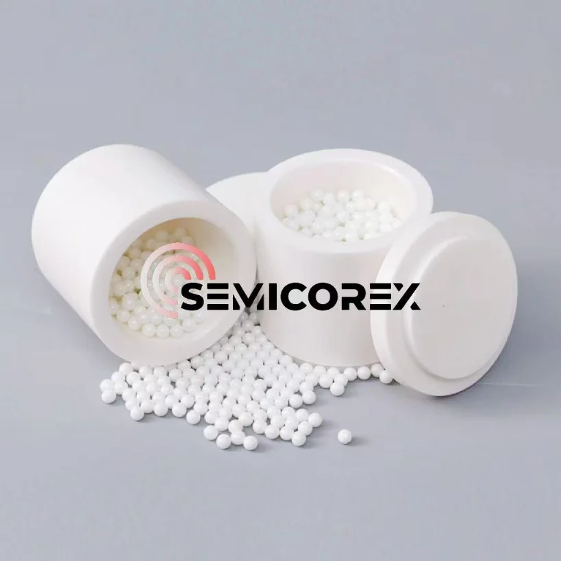 मिलिंग कंटेनरला मिल्ड मटेरियलच्या शुद्धतेवर परिणाम होण्यापासून रोखण्यासाठी, सेमिकोरेक्स कच्च्या मालाची निवड आणि झिरकोनिया मिलिंग जारच्या प्रक्रिया पद्धतींमध्ये कठोर नियंत्रणे वापरते. उच्च-शुद्धतेच्या झिरकोनिया पावडरसह बनवलेल्या झिरकोनिया ग्राइंडिंग जार उच्च-तापमान आणि उच्च-गती ऑपरेटिंग परिस्थितीत पदार्थांचे अनावश्यक दूषित परिणाम प्रभावीपणे टाळू शकतात. त्यांच्यामध्ये उत्कृष्ट रासायनिक गंज प्रतिरोधकता आहे, जी प्रक्रियेदरम्यान मिलिंग सामग्रीसह रासायनिक प्रतिक्रिया कमी करू शकते.